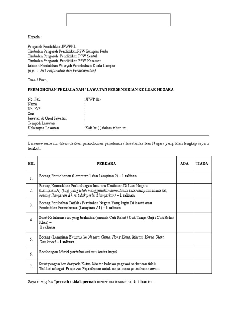 Setiap penjawat awam yang ingin ke. Borang Perjalanan Ke Luar Negara 1. Permohonan Perjalanan Pegawai Awam Ke Luar Negara Atas Urusan Persendirian Surat Pekeliling Borang.