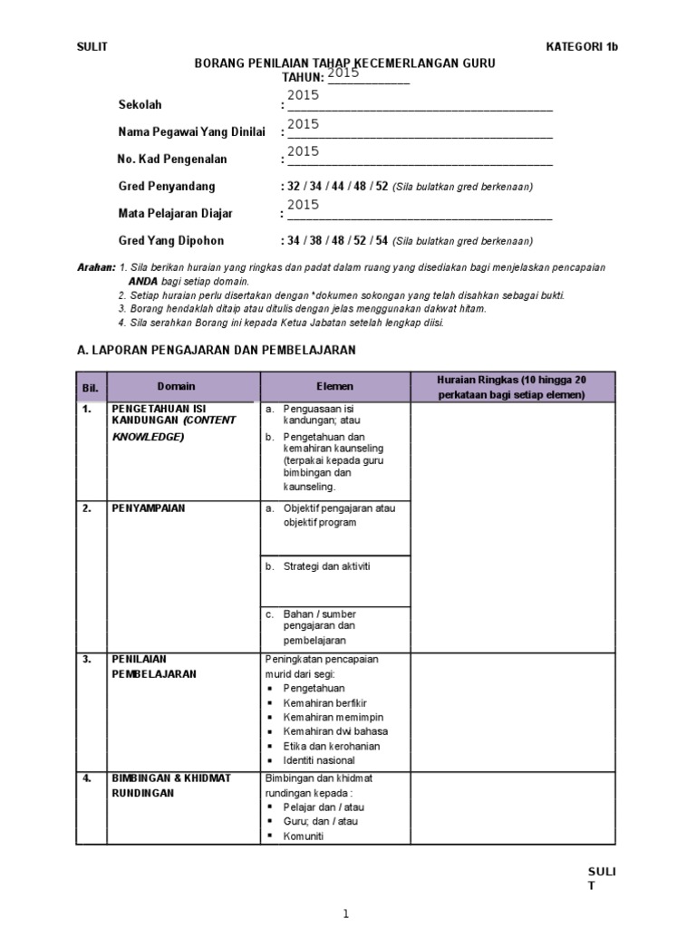 Sulit kategori 1b contoh borang penilaian tahap kecemerlangan guru tahun. Kategori 1 kategori 2 kategori 3 kategori 3 kategori 3. SULIT KATEGORI 1b SULIT 1 BORANG PENILAIAN TAHAP KECEMERLANGAN GURU TAHUN.
